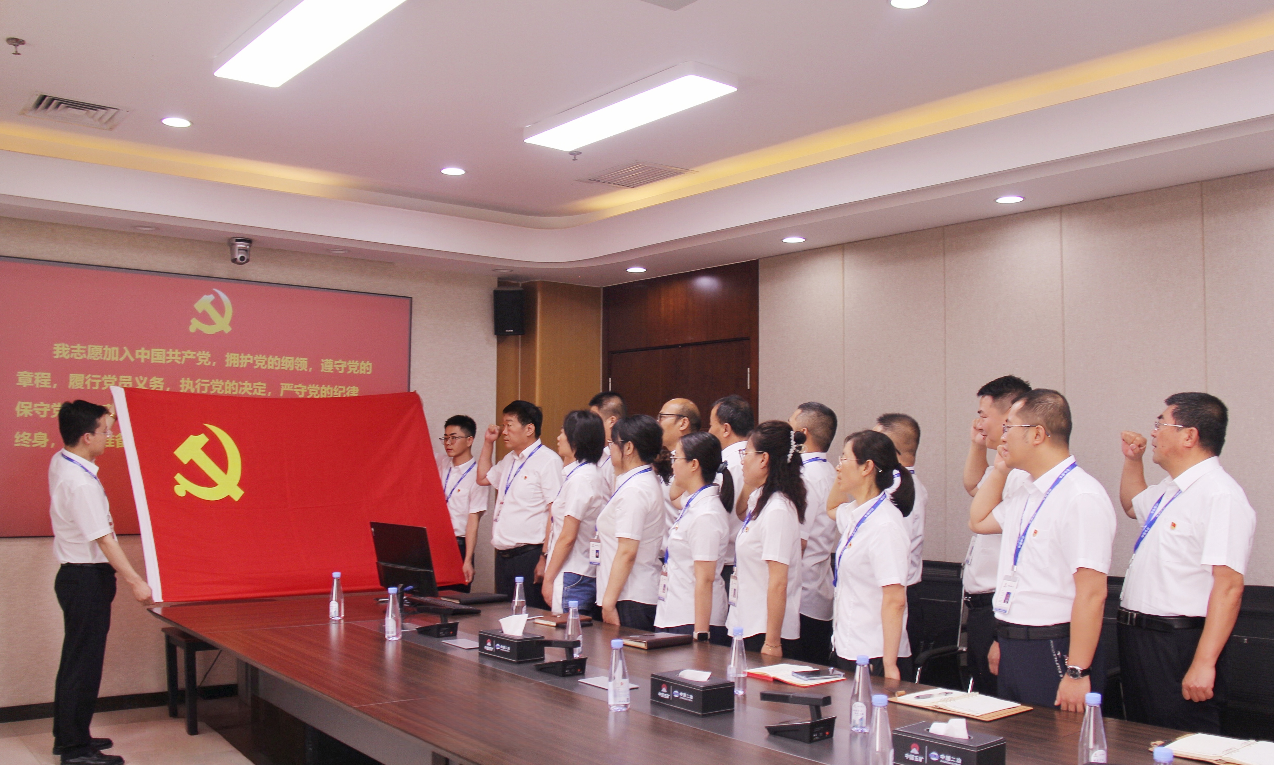 分公司機(jī)關(guān)黨支部全體黨員在領(lǐng)誓人的帶領(lǐng)下,整齊列隊(duì),面對鮮紅的中國共產(chǎn)黨黨旗,高舉右拳,齊聲莊嚴(yán)宣誓。