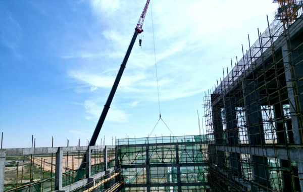 本次吊裝的鋼屋架跨度18米、梁高2.9米,距地面 18.85米,單榀重量達1.5噸。面對高溫天氣及吊裝區(qū)域環(huán)境復雜、空間狹小,土建與安裝作業(yè)交叉等多重挑戰(zhàn),項目部全員堅守崗位,一方面對現(xiàn)場管理人員與作業(yè)人員進行周密分工,圍繞施工方法、安全操作規(guī)程等內(nèi)容開展多輪詳細培訓;另一方面在高溫條件下多次組織勘查吊裝位置、規(guī)劃吊裝路徑、優(yōu)化吊裝方案,全過程嚴把安全與質(zhì)量關,確保各工序嚴格按方案推進。