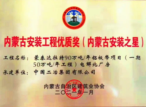 近日,由中國二冶鋼構(gòu)分公司施工的蒙泰達拉特鋁板帶項目(一期50萬噸電解鋁工程),被內(nèi)蒙古自治區(qū)建筑業(yè)協(xié)會評選為內(nèi)蒙古安裝工程優(yōu)質(zhì)獎(內(nèi)蒙古安裝之星)。