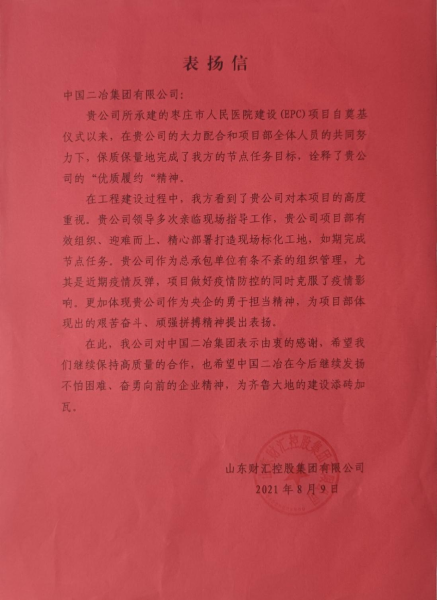 8月9日,中國二冶收到業(yè)主單位山東財匯控股集團有限公司的表揚信,來信對中國二冶集團科學組織、精心部署表示感謝,對棗莊人民醫(yī)院建設(shè)(EPC)項目當前的各項工作進展情況給予了高度贊揚。