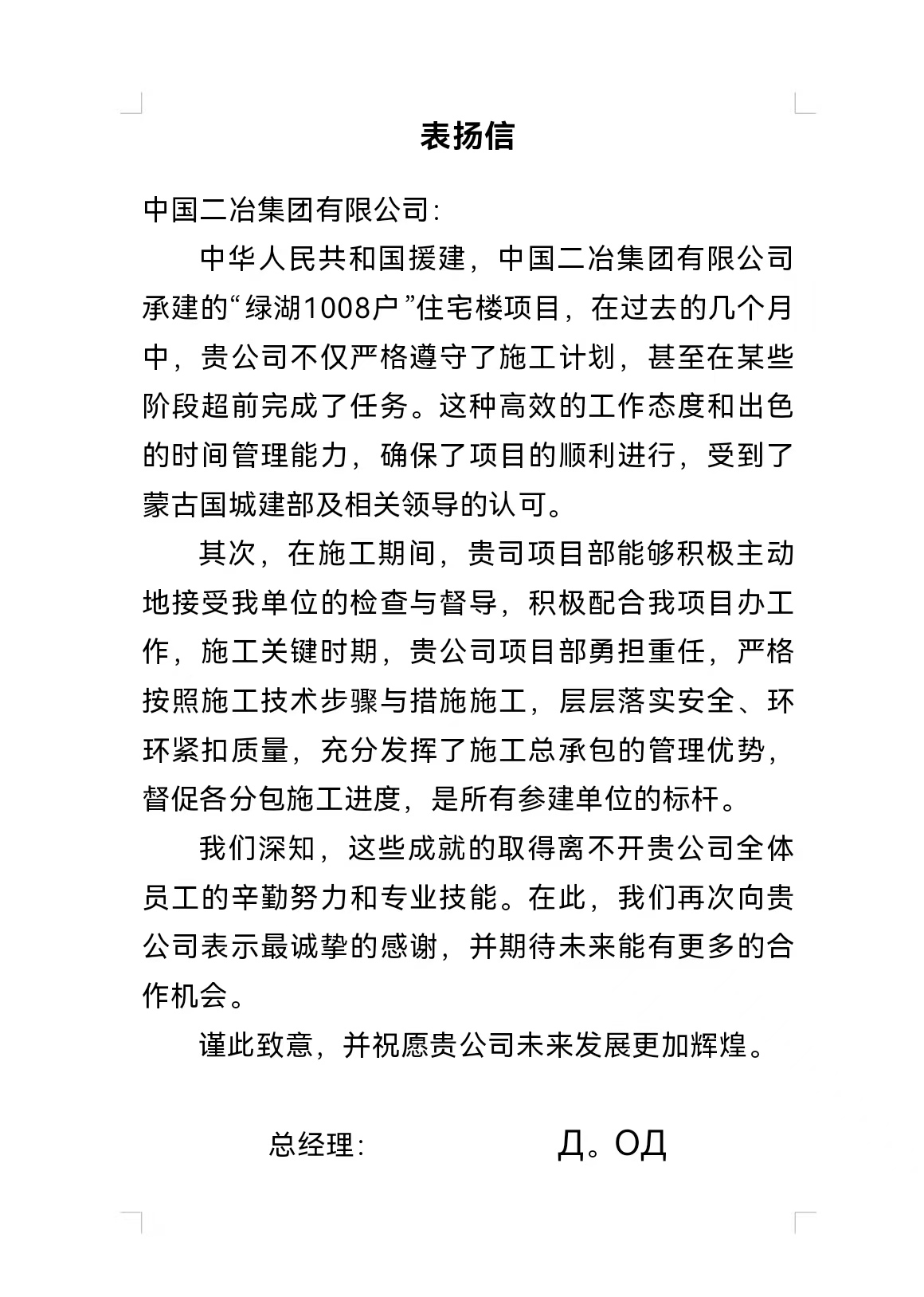 表?yè)P(yáng)信指出,由中華人民共和國(guó)援建、中國(guó)二冶承建的“綠湖1008戶”住宅樓項(xiàng)目遵守施工計(jì)劃,在重要節(jié)點(diǎn)重要工序超前完成了施工任務(wù),受到了蒙古國(guó)城建部及相關(guān)領(lǐng)導(dǎo)的認(rèn)可。施工期間,項(xiàng)目部能夠主動(dòng)接受檢查與督導(dǎo),積極配合,協(xié)同發(fā)力,尤其是施工關(guān)鍵時(shí)期,項(xiàng)目部勇?lián)厝?,?yán)格按照工程技術(shù)、設(shè)計(jì)規(guī)范、施工步驟與措施,層層落實(shí)安全、環(huán)保責(zé)任,緊扣質(zhì)量標(biāo)準(zhǔn),抓實(shí)分部分項(xiàng)工程質(zhì)量,充分發(fā)揮了施工總承包方的管理優(yōu)勢(shì),全方位督促各分包施工進(jìn)度,加快項(xiàng)目建設(shè)步伐,是所有參建單位的標(biāo)桿,充分彰顯了中國(guó)央企的實(shí)力。