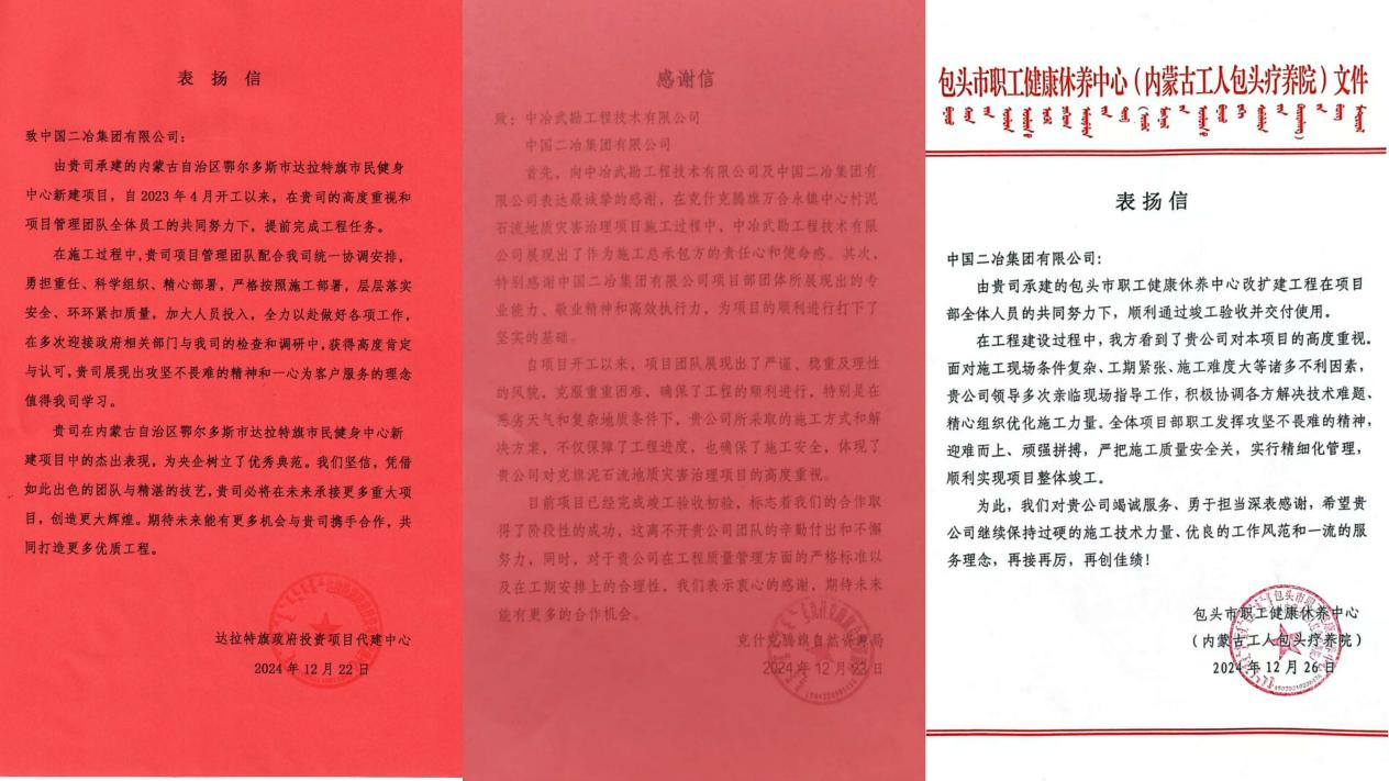 近日,中國二冶先后收到來自達(dá)拉特旗政府投資項目代建中心、克什克騰旗自然資源局以及包頭市職工健康休養(yǎng)中心的三封表揚信。信中高度贊揚了中國二冶在達(dá)旗健民中心項目、赤峰泥石流項目、包頭康養(yǎng)項目建設(shè)中展現(xiàn)出的卓越專業(yè)能力、嚴(yán)謹(jǐn)施工態(tài)度以及為地方經(jīng)濟(jì)社會發(fā)展作出的積極貢獻(xiàn)。