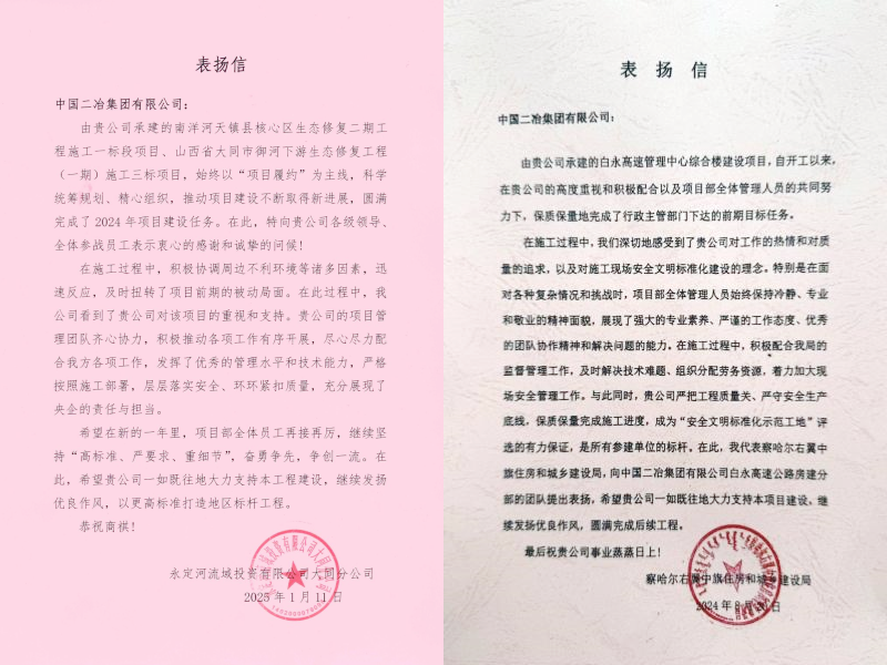 兩封表?yè)P(yáng)信真摯誠(chéng)懇、情真意切,是對(duì)中國(guó)二冶高質(zhì)量施工管理和匠心鑄造精品工程的一致認(rèn)可。下一步,中國(guó)二冶將繼續(xù)發(fā)揚(yáng)“彰顯央企擔(dān)當(dāng),鑄就永恒精品”的企業(yè)使命,圓滿完成后續(xù)各項(xiàng)工作任務(wù),確保項(xiàng)目高質(zhì)量完美履約,為公司與業(yè)主交上一份滿意答卷。