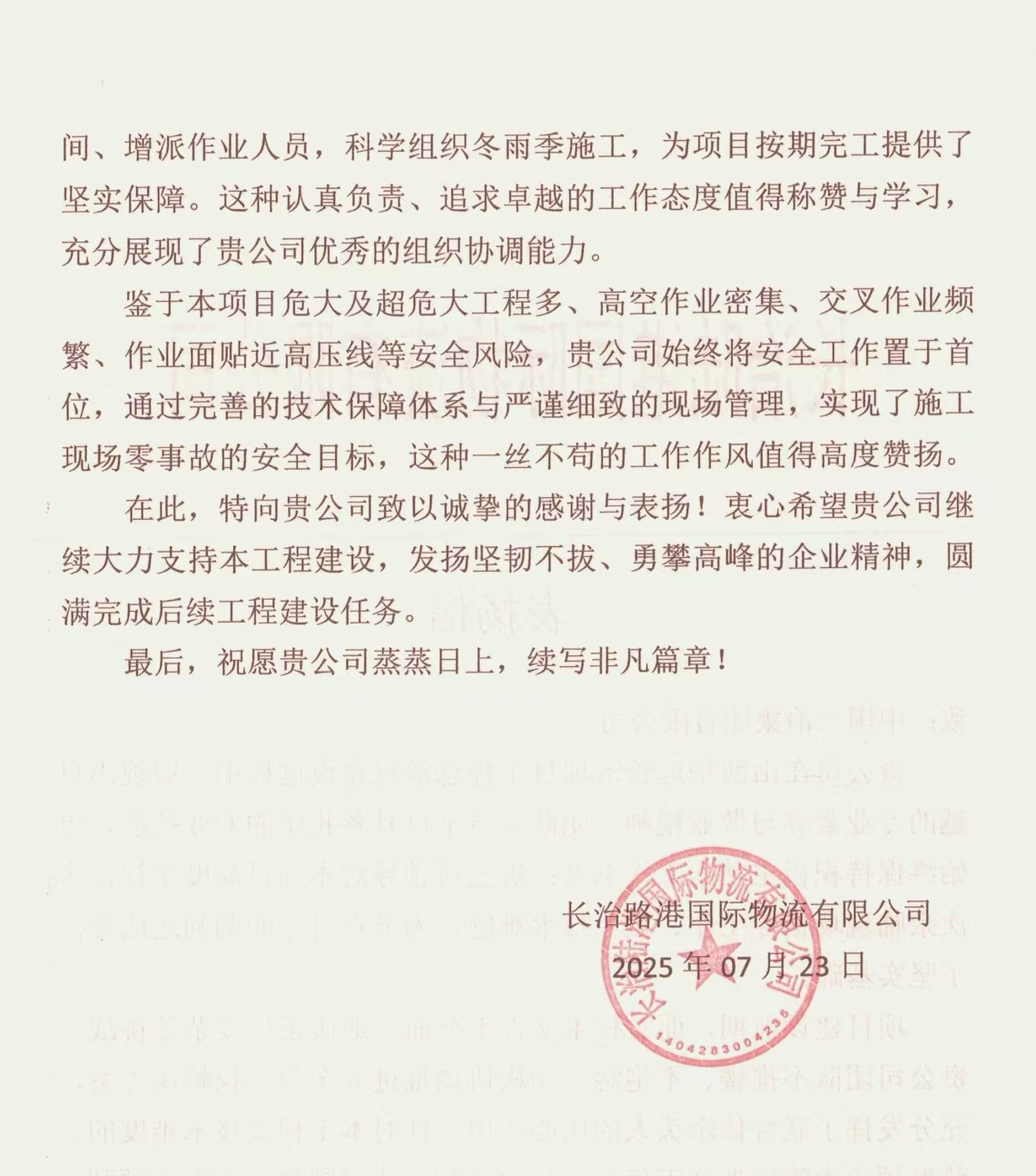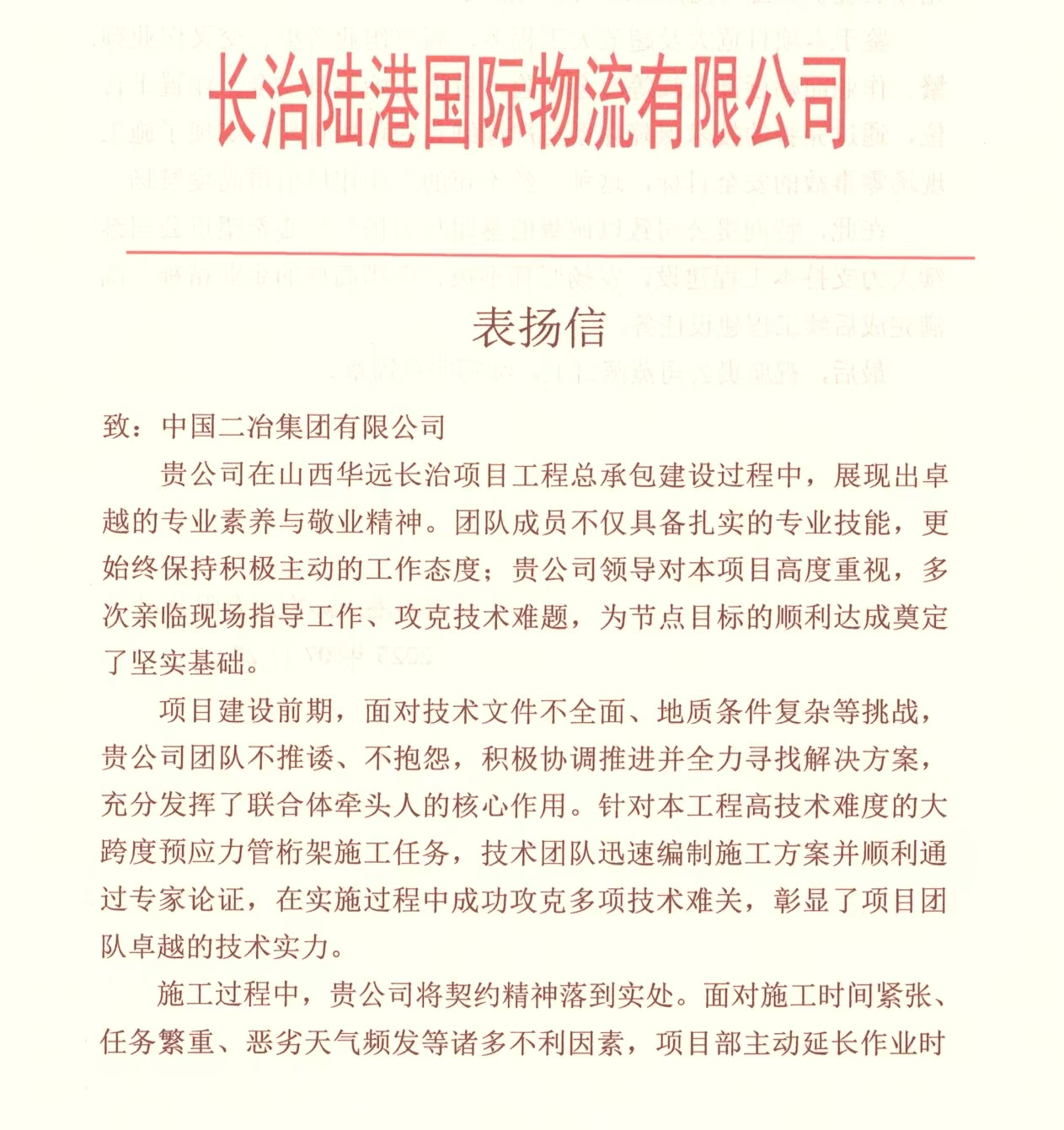 中國二冶收到長治陸港國際物流有限公司表揚信