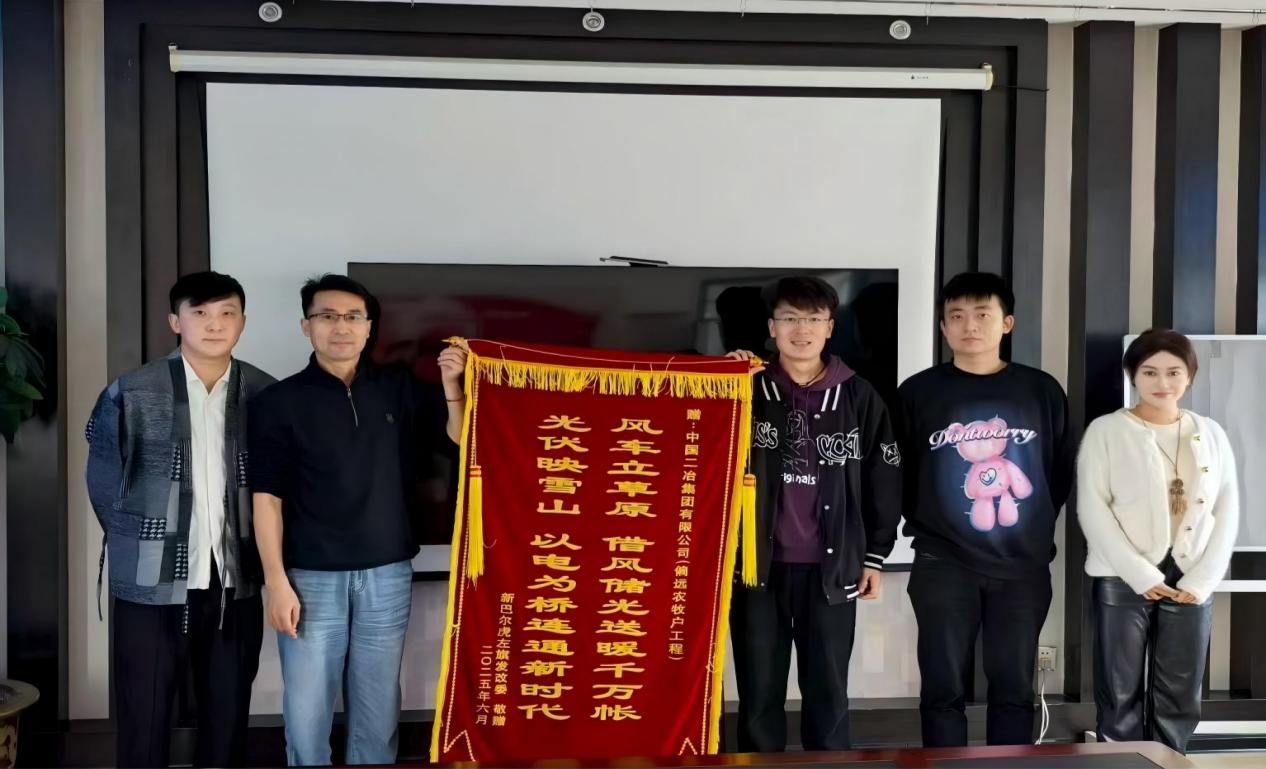 錦旗上題寫(xiě)“風(fēng)車(chē)立草原,借風(fēng)儲(chǔ)光送暖千萬(wàn)帳;光伏映雪山,以電為橋連通新時(shí)代”,生動(dòng)詮釋了項(xiàng)目的核心價(jià)值與深遠(yuǎn)意義。新巴爾虎左旗政府表示,該項(xiàng)目地處內(nèi)蒙古偏遠(yuǎn)牧區(qū),氣候條件惡劣、交通出行不便,整體施工環(huán)境極為艱苦。面對(duì)挑戰(zhàn),項(xiàng)目管理團(tuán)隊(duì)充分發(fā)揮技術(shù)與管理優(yōu)勢(shì),始終以“高標(biāo)準(zhǔn)、高質(zhì)量、高效率”為施工準(zhǔn)則,全力克服物資運(yùn)輸困難、極端天氣影響等多重難題,最終如期完成節(jié)點(diǎn)任務(wù)。該項(xiàng)目的順利推進(jìn),不僅成功解決了當(dāng)?shù)剞r(nóng)牧民的急難愁盼問(wèn)題,直接惠及數(shù)百戶(hù)農(nóng)牧民家庭,顯著提升了牧區(qū)群眾的生活品質(zhì);更通過(guò)產(chǎn)業(yè)配套升級(jí),為當(dāng)?shù)亟?jīng)濟(jì)可持續(xù)發(fā)展注入了新動(dòng)能,為邊疆牧區(qū)發(fā)展奠定了堅(jiān)實(shí)基礎(chǔ)。