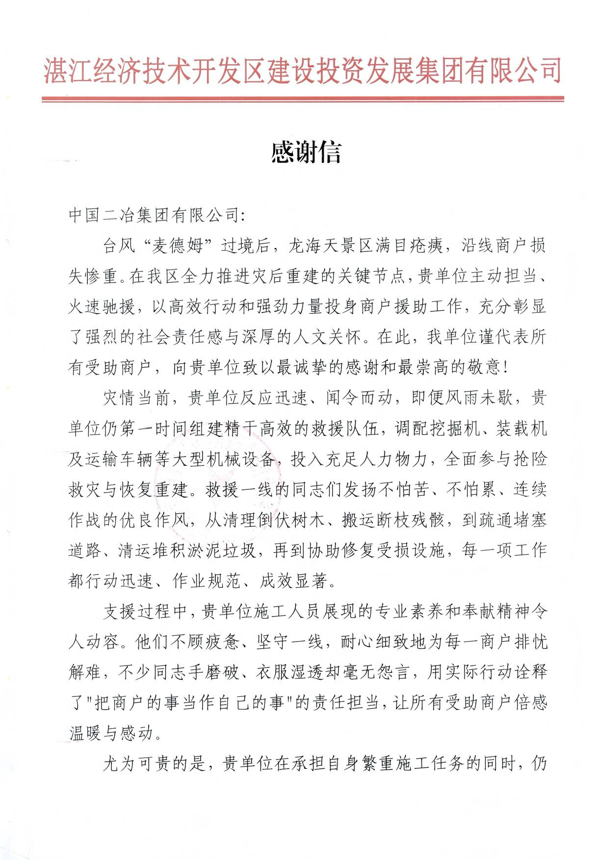 表?yè)P(yáng)信指出,臺(tái)風(fēng)“麥德姆”給龍海天景區(qū)及沿線商戶(hù)造成嚴(yán)重?fù)p失,災(zāi)后重建工作迫在眉睫。關(guān)鍵時(shí)刻,中國(guó)二冶主動(dòng)請(qǐng)纓、迅速響應(yīng),在風(fēng)雨未歇之際組建精干救援隊(duì)伍,調(diào)配挖掘機(jī)、裝載機(jī)等大型機(jī)械設(shè)備,投入充足人力全力參與搶險(xiǎn)。救援人員發(fā)揚(yáng)連續(xù)作戰(zhàn)的優(yōu)良作風(fēng),高效開(kāi)展倒伏樹(shù)木清理、斷枝搬運(yùn)、道路疏通、淤泥清運(yùn)及受損設(shè)施修復(fù)等工作,作業(yè)規(guī)范、成效顯著。施工人員不顧疲憊與辛勞,耐心為商戶(hù)排憂解難,部分人員手磨破、衣服濕透仍毫無(wú)怨言,用實(shí)際行動(dòng)詮釋了“把商戶(hù)的事當(dāng)作自己的事”的責(zé)任擔(dān)當(dāng),讓受助商戶(hù)倍感溫暖。表?yè)P(yáng)信特別提到,中國(guó)二冶在承擔(dān)自身繁重施工任務(wù)的同時(shí),仍能高效有序推進(jìn)援助工作,充分展現(xiàn)了卓越的管理水平、強(qiáng)大的組織協(xié)調(diào)能力及過(guò)硬的應(yīng)急處置實(shí)力。
