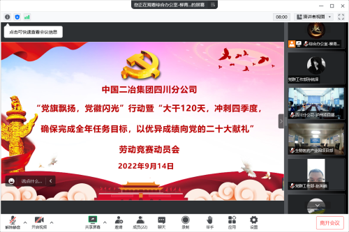 9月14日,四川分公司召開(kāi)“黨旗飄揚(yáng)、黨徽閃光”行動(dòng)暨“大干 120 天、沖刺四季度,確保完成全年任務(wù)目標(biāo),以優(yōu)異成績(jī)向黨的二十大獻(xiàn)禮”勞動(dòng)競(jìng)賽動(dòng)員會(huì),分公司黨委書記劉喆作動(dòng)員講話并主持會(huì)議,公司副總經(jīng)濟(jì)師、四川分公司總經(jīng)理鮑文明宣布勞動(dòng)競(jìng)賽啟動(dòng)。
