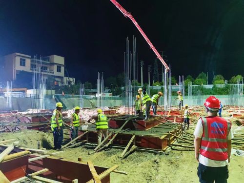 在4#廠房混凝土澆筑期間,夜已很深,陰雨連綿,但是施工現(xiàn)場依舊燈火通明,管理人員施工口令陣陣,運(yùn)輸車輛源源不斷,各種機(jī)械聲不絕于耳,構(gòu)成了一幅壯觀的“挑燈夜戰(zhàn)圖”……面對緊張的節(jié)點(diǎn)工期、繁重的任務(wù)目標(biāo),在這沒有硝煙的戰(zhàn)場上,項(xiàng)目上下正進(jìn)行著一場場與時間賽跑的攻堅戰(zhàn),各施工作業(yè)班組人員采取“緊密配合,見縫插針,立體交叉”的勞動形式,快馬加鞭,攻堅克難,全力推進(jìn)項(xiàng)目建設(shè),有效地保障了工程進(jìn)度。